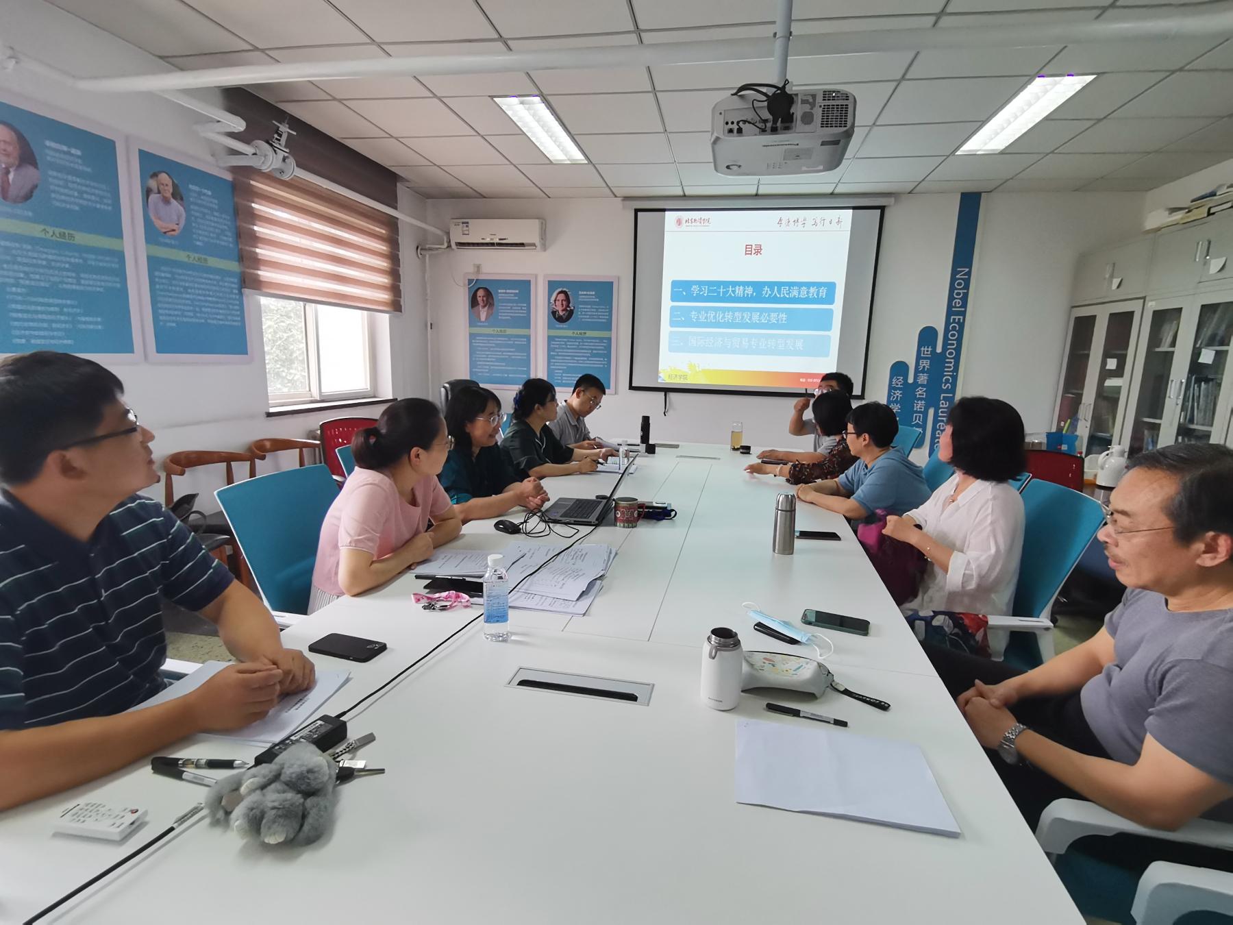 会上,教学副经理原玲玲老师首先讲了主题为“办人民满意教育,促进专业转型发展”的党课,内容主要包括:学习二十大精神,办人民满意教育;专业优化转型发展必要性以及国际经济与贸易专业转型发展三部分主要内容。大家主要围绕第三部分展开讨论,涉及:专业定位、培养模式、课程体系、教师在专业转型中的任务。