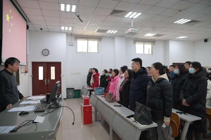 首先,在李义福老师的主持下,全体老师起立,奏唱国歌。