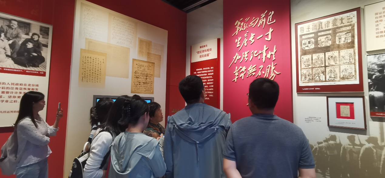 展览共分为五个部分:进京赶考、进驻香山、继续指挥解放全中国、新中国筹建以及不忘初心、牢记使命、永远奋斗。展览遵循历史发展顺序,在馆内文字、文件、影像等史料的全方位展示下,师生党员们深入学习了中共中央在北京香山的重要革命实践。从1949年毛泽东等中央领导同志率领中共中央机关自西柏坡进驻香山,到中共中央在北京香山指挥举世闻名的渡江战役,再到中共中央同各民主党派、各界人士共同筹备中国人民政治协商会议,擘画新中国的宏伟蓝图……一幅恢弘的历史画卷在大家面前徐徐展开,描绘了中国共产党领导中国人民走向胜利的光辉历程。