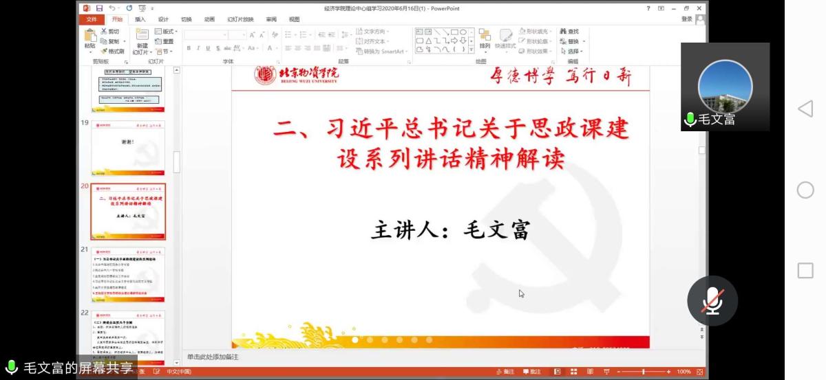 接着,霍烨老师从背景、事情经过、对高校工作的启示等方面对习近平总书记给北京科技大学全体巴基斯坦职工回信进行了详细解读。北京科技大学全体巴基斯坦职工给习近平总书记写信和习近平总书记给北京科技大学全体巴基斯坦职工回信充分证明,中巴两国是患难与共的真朋友、同甘同苦的好兄弟。习近平总书记给北京科技大学全体巴基斯坦职工的回信,充分体现了人民至上、生命至上和人类命运共同体的思想和理念。习近平总书记的回信对于中国青年同包括巴基斯坦在内的世界各国青年进行交流,同世界各国青年一道,携手为促进民心相通、推动构建人类命运共同体具有十分深远的重大意义。