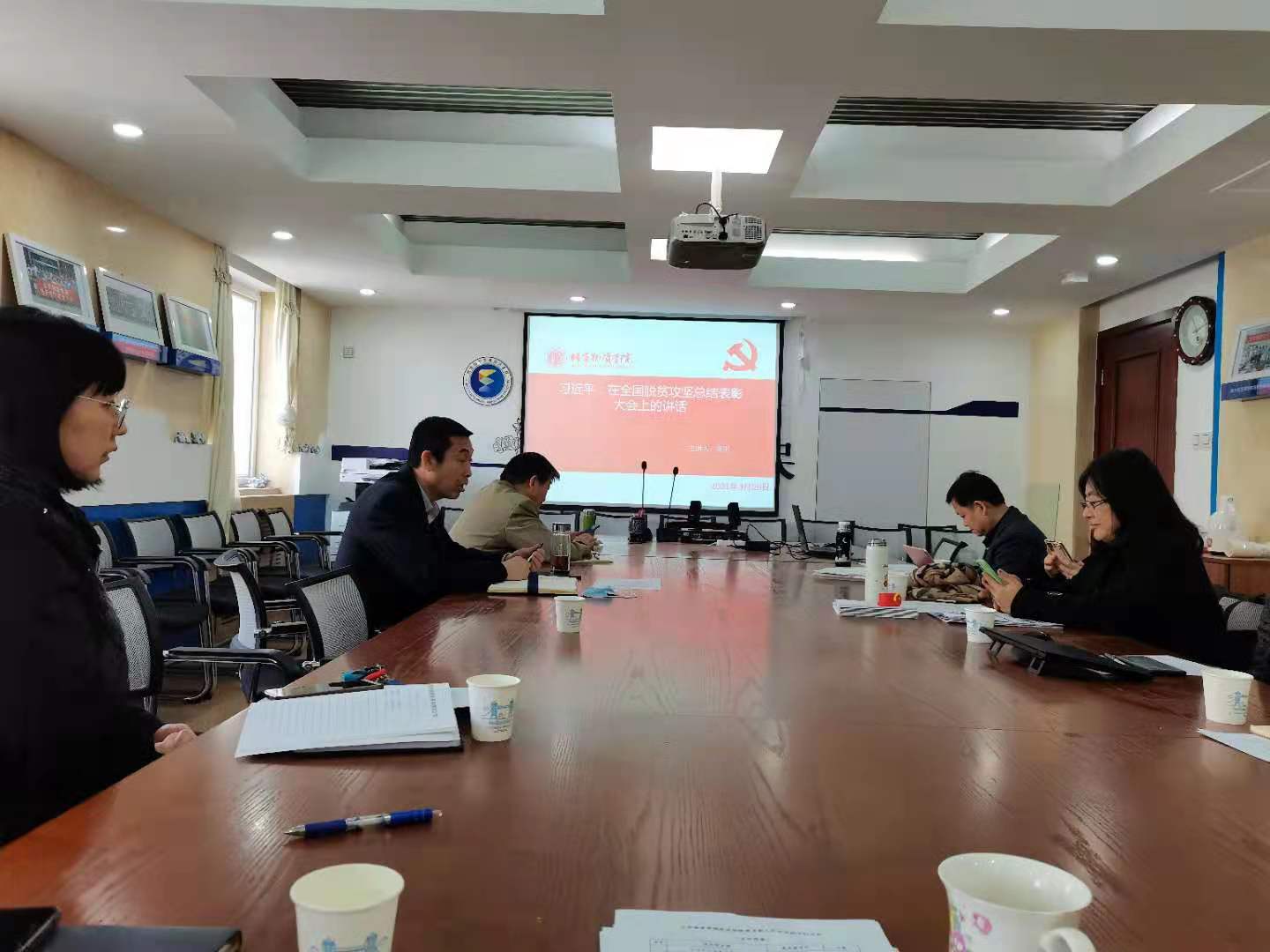 国贸系教工支部书记李彤老师主讲了《习近平总书记在全国脱贫攻坚总结表彰大会上的讲话》。李老师详细介绍了习近平总书记在全国脱贫攻坚总结表彰大会上的讲话的五个部分,第一部分用图片展示了表彰的先进个人楷模和先进集体楷模;第二部分讲解了五个历史性成就;第三部分生动介绍了七个中国特色反贫困理论;第四部分简要总结了六种脱贫攻坚精神;第五部分是任重道远,号召全国人民乘势而上、再接再厉、接续奋斗。听完李老师的讲解,了解了全国脱贫攻坚取得的重大成果,老师们深受感动和震撼,全国脱贫攻坚战的胜利,对农村的意义巨大,对弱势群体的帮助很大,对社会公平、社会稳定有很重大的意义。