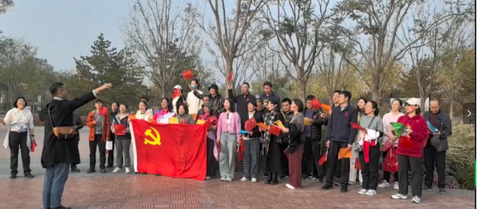 徒步活动进行到下午3点半,东西两队在小满亭顺利汇合。全体教职工在此举行了别具意义的活动——合唱《歌唱祖国》。饱含深情的旋律,在绿意盎然的公园中悠然回荡,每位教职工都用自己的方式表达着对祖国的敬爱与自豪。这不仅是一次体育活动,更是一次爱国主义教育的实践。