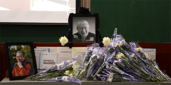 在追思会现场,在一方讲桌上,摆放着顾老师的照片和顾老师生前出版的论文、著作。而背后的大屏幕上则回放着顾老师生前与公司领导、同事、员工一起参与的各项活动。前来缅怀顾老师的师生都献上了一束束鲜花,在顾老师照片前深深地鞠上一躬,以表达哀思之情。