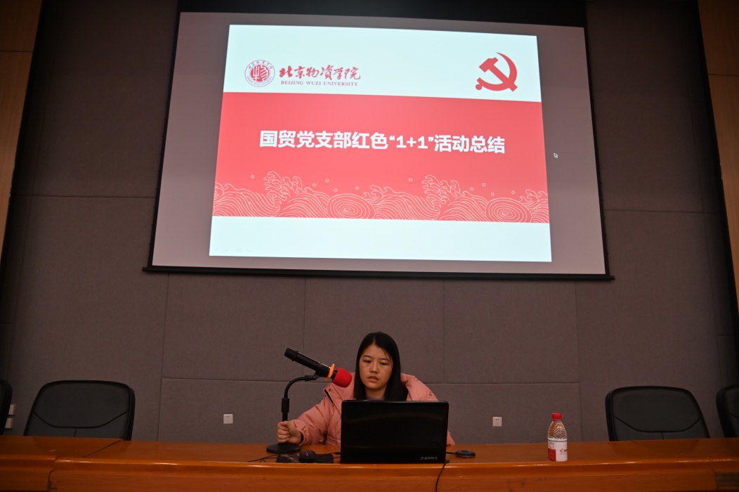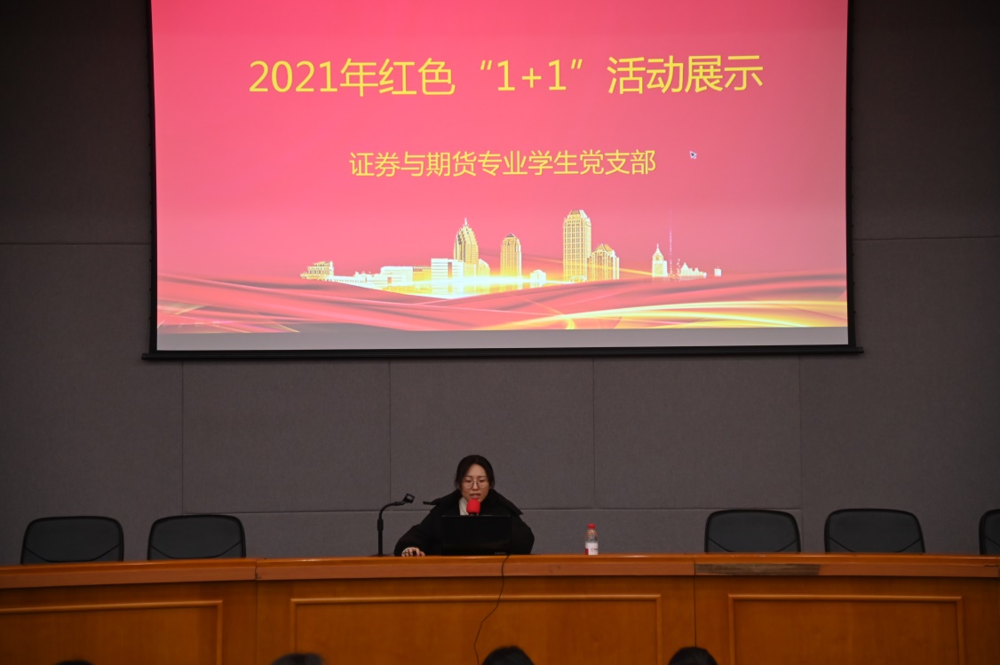 随后,各员工党支部进行了2021年红色1+1总结展示。国际经济与贸易专业员工党支部李可可、经济学专业员工党支部王琦、金融学专业员工党支部廖一浍、证券与期货专业员工党支部马金金同学分别上台展示。