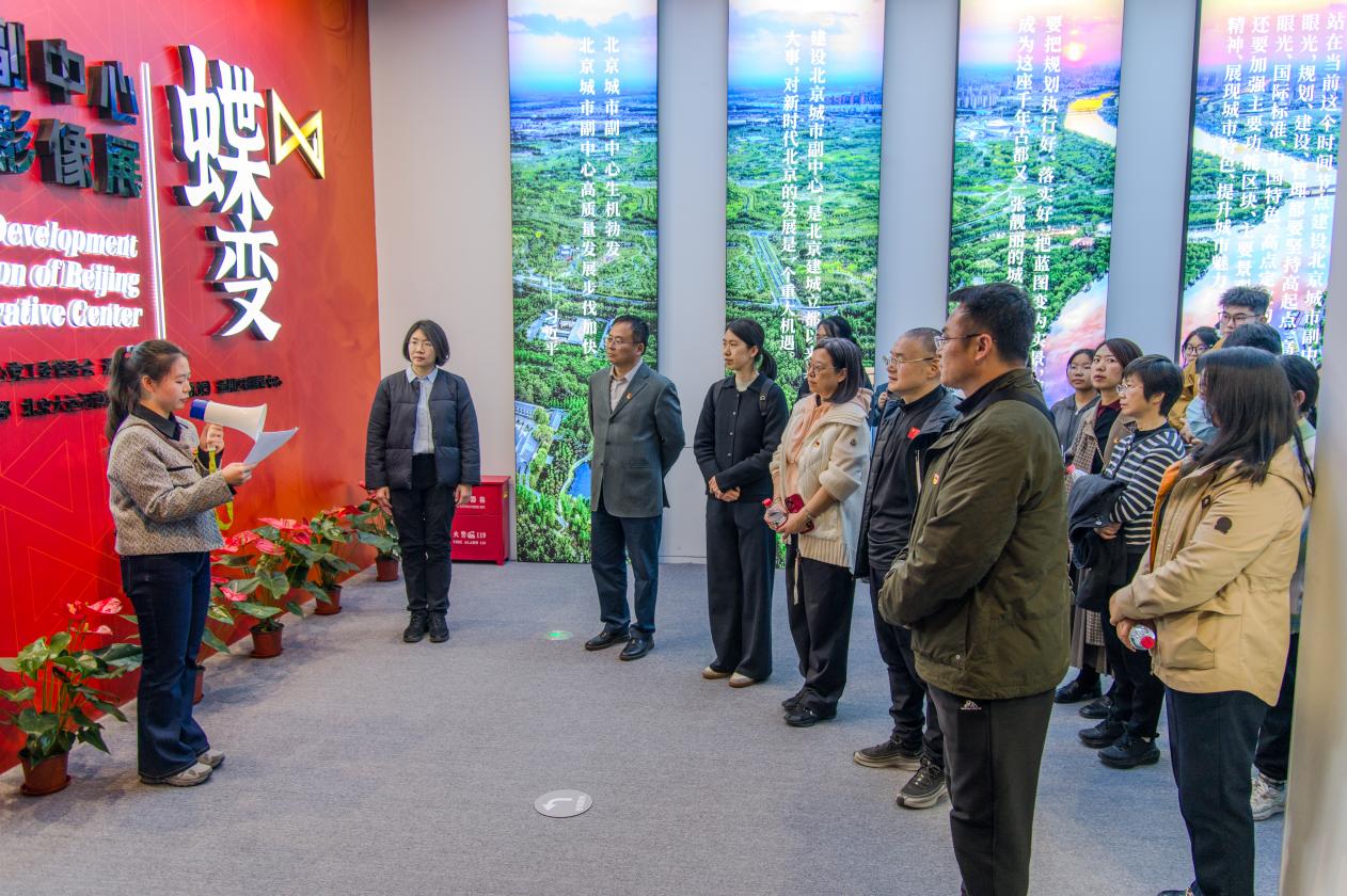 步入展厅,伟德国际bevictor1946员工党员代表周彦希同学先向大家简单介绍了整个展厅的主要内容。城市副中心建设发展影像展以“蝶变”为主题,分为“千年大计国家大事”、“生机勃发 拔节生长”、“水城共融 蓝绿交织”和“近悦远来 心向往之”四个部分,分类介绍了北京城市副中心区域内重点工程的变化,京津冀协同发展成果和地下空间;北京城市副中心在两区建设、产业培育、特色小镇、文化旅游等方面的发展;北京城市副中心的生态布局及发展和民生建设,展现了与市民生活息息相关的公共服务资源的快速推进。