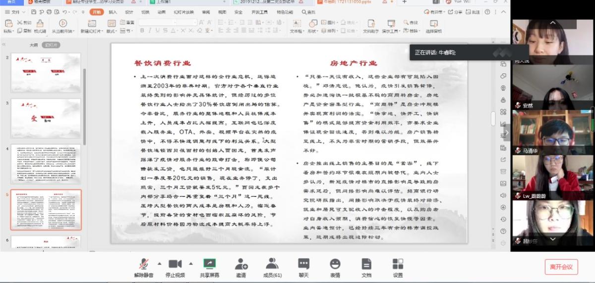 在长达两个小时的研讨会议中,首先由党支部书记冯琪老师介绍本次理论学习的背景及意义,其后党支部的12名员工党员依次从不同角度、不同金融领域,利用专业内所学知识及金融相关拓展知识,从整体经济层面出发,首先讨论当前疫情经济政策方向及有序复工复产逐渐恢复产能后,对于总需求总供给方面的冲击影响;进而结合互联网金融等新兴模式,谈论国际贸易进出口、原油、股市、期货市场、信贷危机等严峻话题;再到疫情对我国企业及民生的诸多不利影响,作为党员又应如何进行帮扶等民生问题。会议期间,大家踊跃发言,三名预备党员分享了此次理论学习的收获与感悟,详细复述了疫情对当前国内宏观经济及国际间经济贸易的影响,并对于如何恢复经济三名同学结合自己的学习体会提出了各自的想法与建议。云端党员分享学习的全新开展形式,丝毫未影响期证支部每位员工党员的积极学习热情,大家踊跃讨论金融问题并记录详细笔记。会议过程中,通过开启的摄像头可以看到所有党员精神面貌饱满,细致聆听后,均深感受益匪浅。