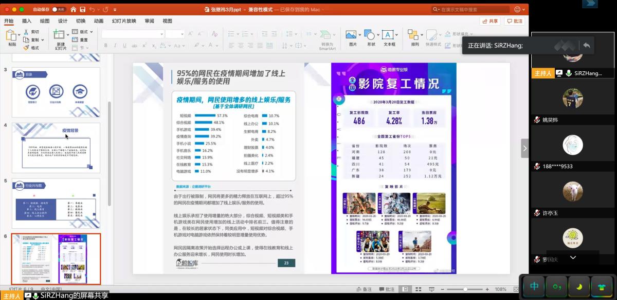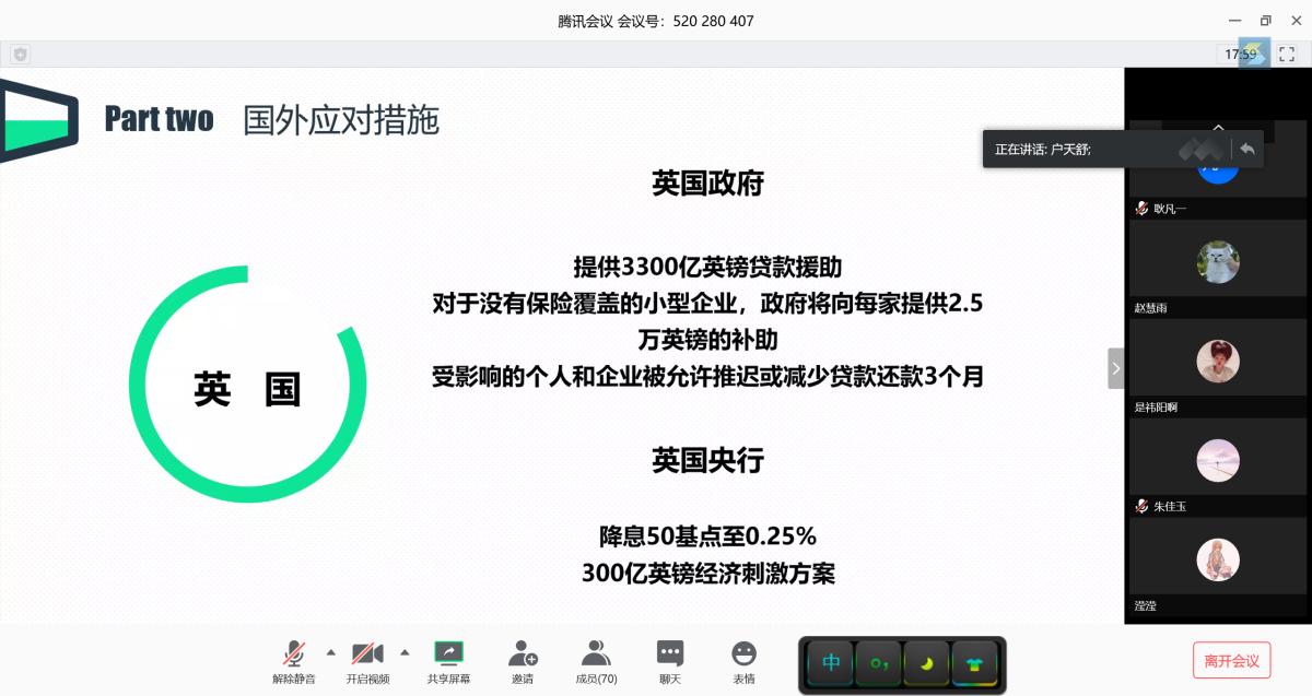 张继祎同志通过进行数据对比,重点分析了疫情期间各行业的兴与败;户天舒同志和廉书源同志主要分析了疫情下国内外财政金融的应对措施,并对比出中国金融体制的优势;屈乾龙同志从三个方面提出了疫情对中国经济增长的深刻挑战,并提出中国经济长期向好的基本趋势并没有改变;张璐同志重点介绍了疫情期间数字经济的推动作用;刘新刚同志将此次疫情与2003年的非典进行比较,对比说明了两次疫情对我国经济影响的相似性与区别;陈冉宁同志从宏观和微观两个方面,介绍了疫情对中国经济的影响;傅婷同志和张新林同志分别介绍了此次疫情对中国经济的长期与短期影响;于璞同志通过swot分析,主要介绍了疫情对第三产业的影响,并从财政政策和货币政策两个方面,提出了自己的意见与建议。