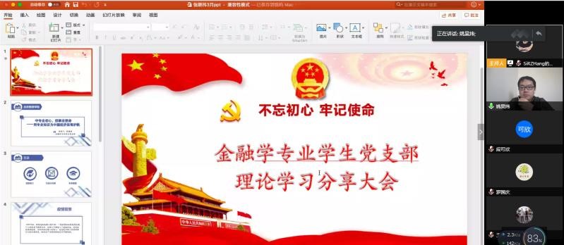 伟德国际bevictor1946金融学专业员工党支部于2020年3月31日中午12时通过腾讯会议在线上开展了三月理论学习分享会。会议由支部书记姚昊炜老师主持,支部全体员工党员及入党积极分子参加了此次会议,并有幸邀请到伟德国际bevictor1946党委书记于冠华老师和金融学专业教工党支部书记陶冶老师参加会议并进行指导。