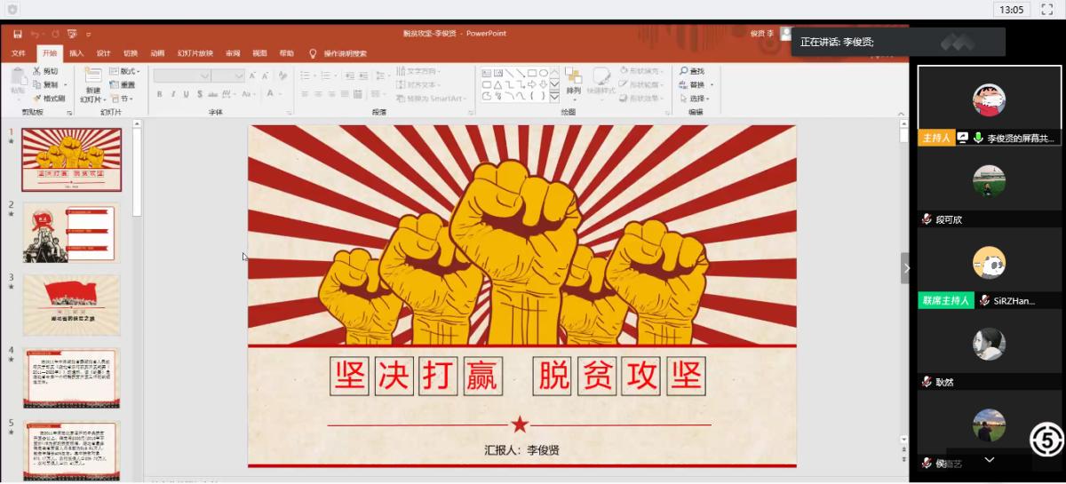 卢媛媛和贾淙沅介绍了我国当前脱贫攻坚工作的完成情况,在此基础上结合疫情介绍了剩余脱贫攻坚工作面临的困难和挑战,并号召老员工对打赢脱贫攻坚战奉献自己的力量;李俊贤、王月龙分别介绍了自己的家乡湖北恩施和北京密云在新冠疫情下的扶贫情况以及取得的扶贫成果;王浩楠、王若和徐慧雅结合具体的事例讲述了在脱贫攻坚工作中的青年老员工力量;