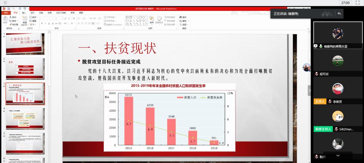 褚傲玮结合图表和数据,从多方面向我们介绍了脱贫攻坚工作的完成情况以及未来的发展目标;侯嘉艺重点介绍了2019年全国脱贫攻坚奖的获奖青年以及他们为脱贫攻坚工作付出的伟大的努力;胡素雅指出我国脱贫攻坚工作的关键在于农村脱贫攻坚工作的有效进行,并结合公司员工的具体事例,讲述了脱贫攻坚工作中的青春力量;朱洁和韩涛从我国的扶贫政策入手,主要介绍了我国的“三农”问题以及目前取得的脱贫成效。
