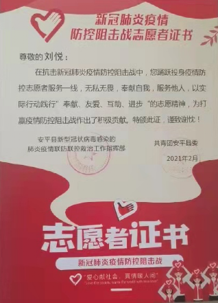 刘悦同学在刚刚结束的校十佳志愿者评选中,历经材料审查、在线投票、评优答辩三轮筛选,成功入选,共累计400+志愿小时数。在校内她担任班级学习委员建设学风,作为员工会社会实践部副部长组织老员工创业活动和寒暑假的社会实践活动。在校外,她积极参与寒假疫情防控志愿者活动、特需儿童庆六一活动等各类志愿行动,践行“奉献、友爱、互助、进步”的志愿者精神。下面,就让我们一起走近她: