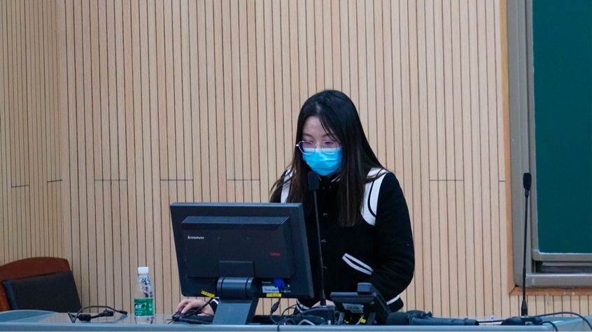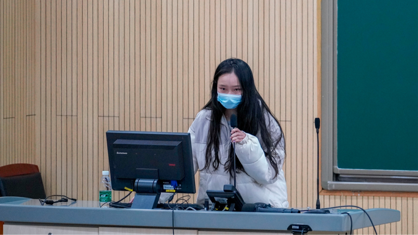 随后,由在大创项目中获得了优异成绩的2020级唐铭苛同学向大家分享了关于参加大创活动的经验与方法。她从什么是大创、大创的准备过程以及大创活动的注意事项等几方面向同学们清楚阐述并仔细说明了她参与大创的经验。