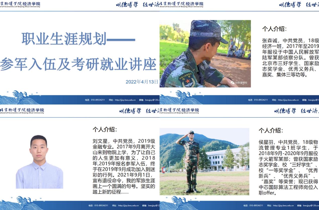 侯星羽学长围绕自己退伍后的就业和升学为中心进行了宣讲。他从退役老员工报考公务员、专场招聘会两个方向宣讲了退伍后的自主就业和择业优势,以及考研专项计划中的升学优势。另外,他还结合了自身面试经历,把在面试中的感悟与收获和同学们进行了分享。