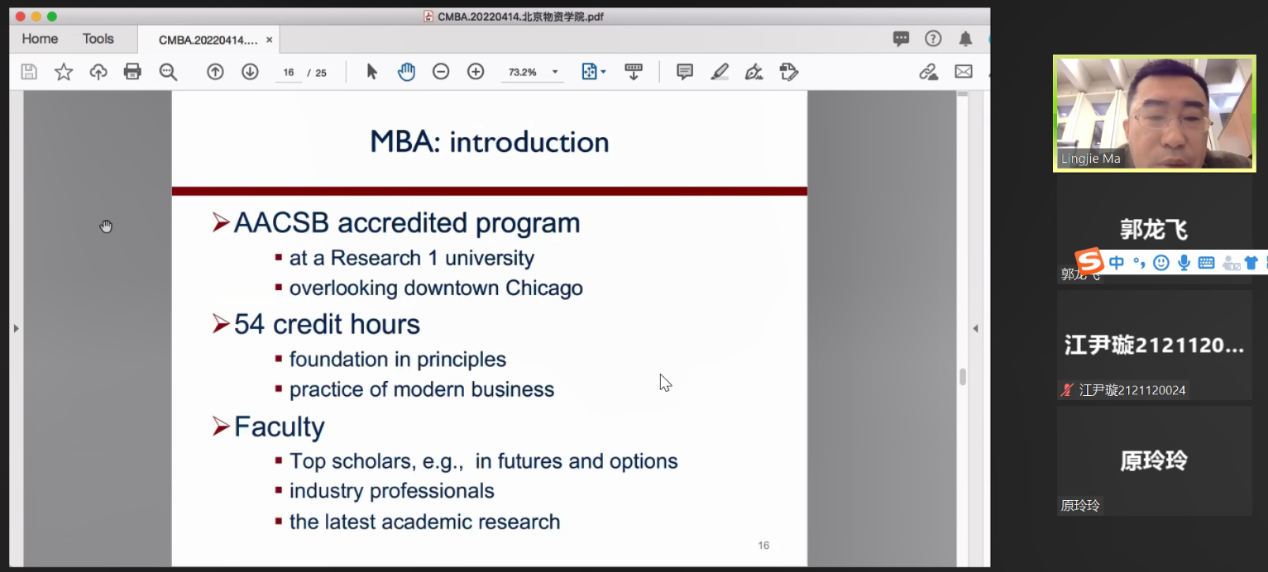 2022年4月14日晚,美国伊利诺伊大学芝加哥分校(University of Illinois at Chicago,简称UIC)商公司副经理马令杰博士受公司伟德国际bevictor1946邀请,在线上为同学们开展了一场关于赴美留学与MBA合作项目的主题宣讲会,会议由伟德国际bevictor1946国际交流负责人郭龙飞老师主持,伟德国际bevictor1946副经理原玲玲教授、辅导员霍烨老师和40余名员工参加了此次宣讲会。