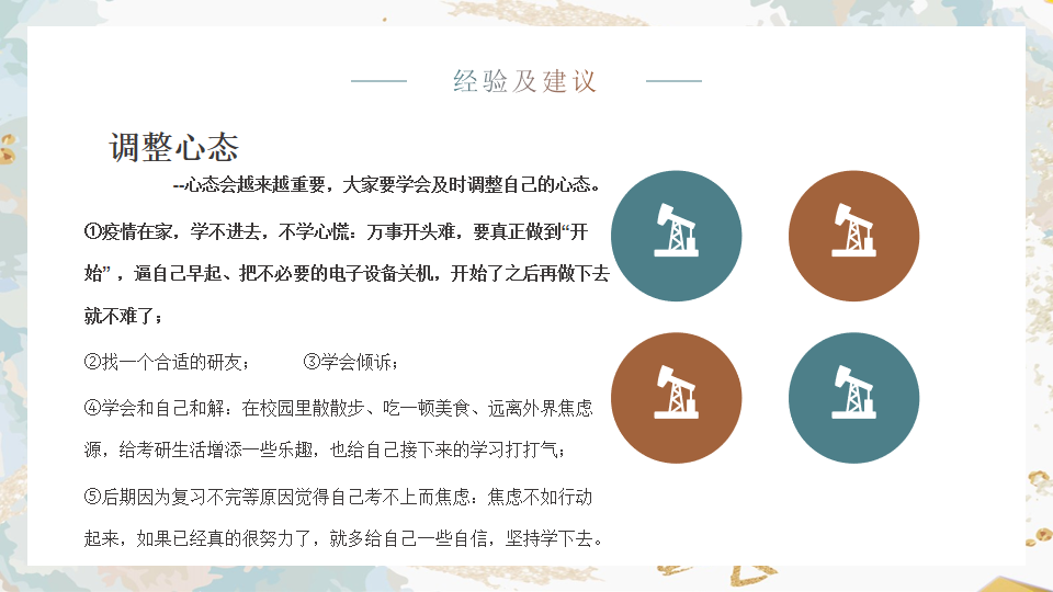 讲座最后,黄珊珊老师进行了总结。首先,“凡事预则立,不预则废”,要提前做好充分的准备;其次,熟能生巧,通过不断的练习达到巩固知识的目的;再次,心态很重要,坚定地向目标前进,行胜于言;最后,坦然面对一切结果,无论成功与否。