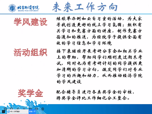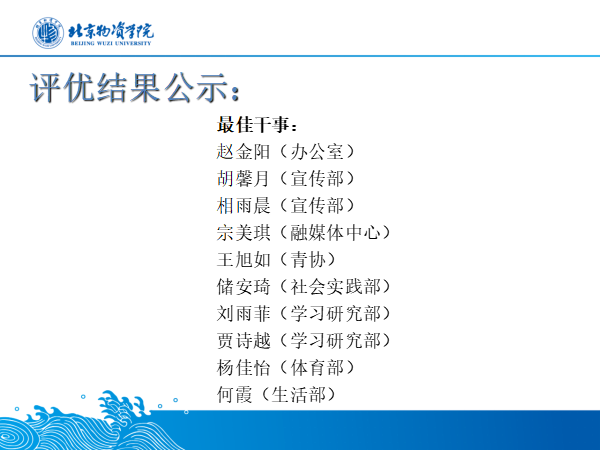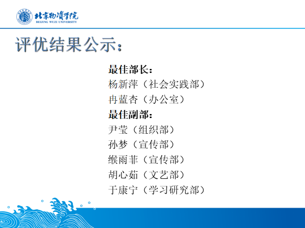 大会第二项,进行评优结果公示。伟德国际bevictor1946分团委员工会轮值主席常含笑同学公布获奖名单,并鼓励获奖同学锐意进取、奋楫笃行,以不畏艰险的勇气与迎难而上的斗志带领员工会全体成员共同进步、共同成长!
