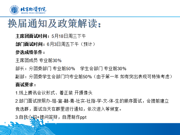 大会第三项,主席团及各部门换届通知。伟德国际bevictor1946分团委副书记张熙萌同学向大家公布了主席团的换届通知并进行政策解读,向与会同学详细分析了继续留任分团委员工会将遇到的的机遇与挑战,并动员鼓励在场同学积极参与换届竞选。