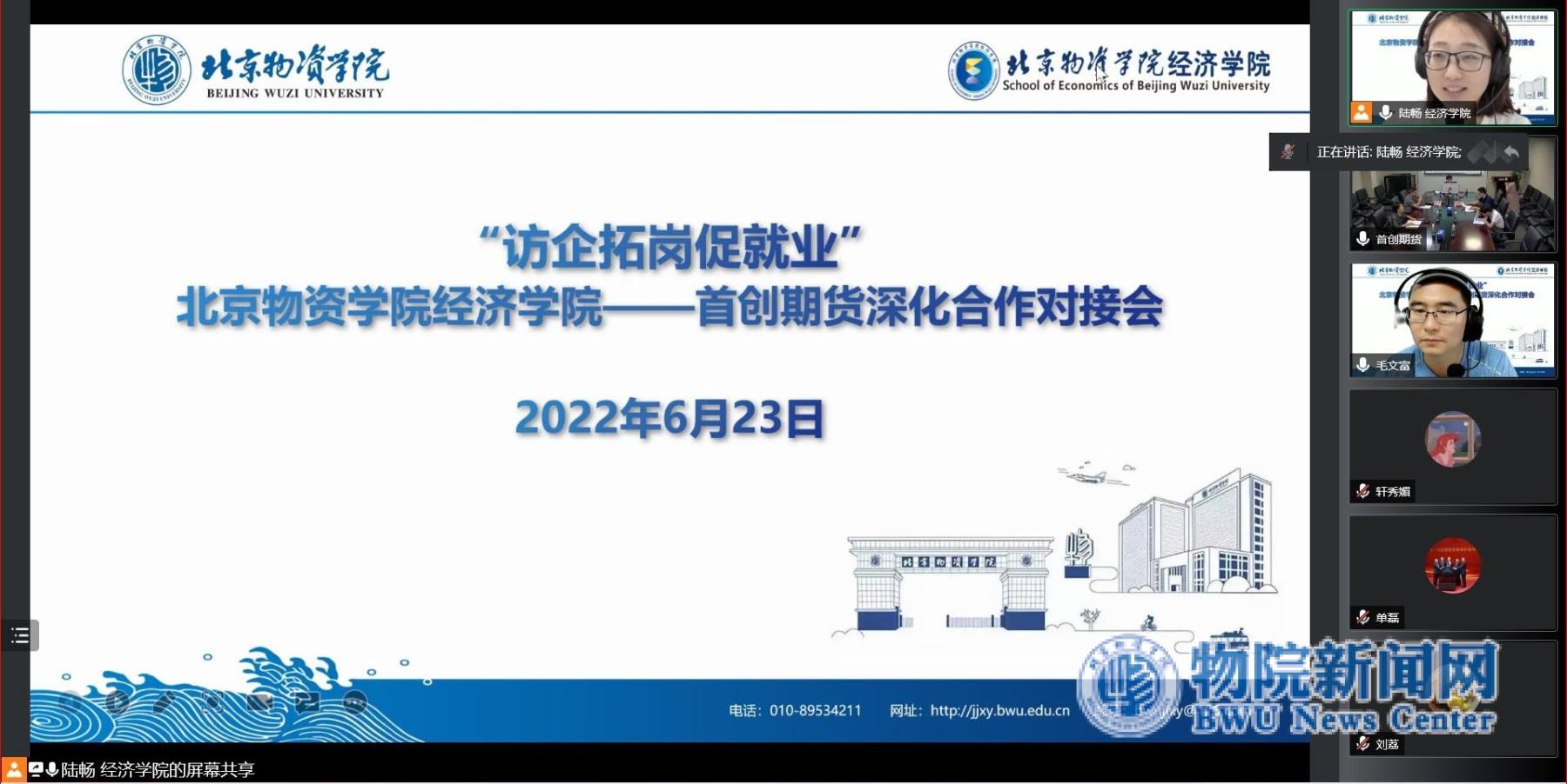 为深入贯彻落实教育部“访企拓岗促就业专项行动”要求,助推毕业生高质量就业,推动校企多领域合作共赢,提升伟德国际bevictor1946就业质量和人才培养质量,2022年6月23日下午,伟德国际bevictor1946与首创期货有限责任公司总经理黄晓、营销总监刘志忠、综合管理部经理黄慧、营销管理总部经理王真、综合管理部人力资源主管田贯雄和综合管理部人力资源专员张娟娟就深化合作在线上展开了深入交流。会议由公司校企合作对接联络人、辅导员陆畅主持,党委副书记毛文富、教学副经理原玲玲、期货与证券教工党支部书记刘荔、期货与证券专业教师单磊参加会议。