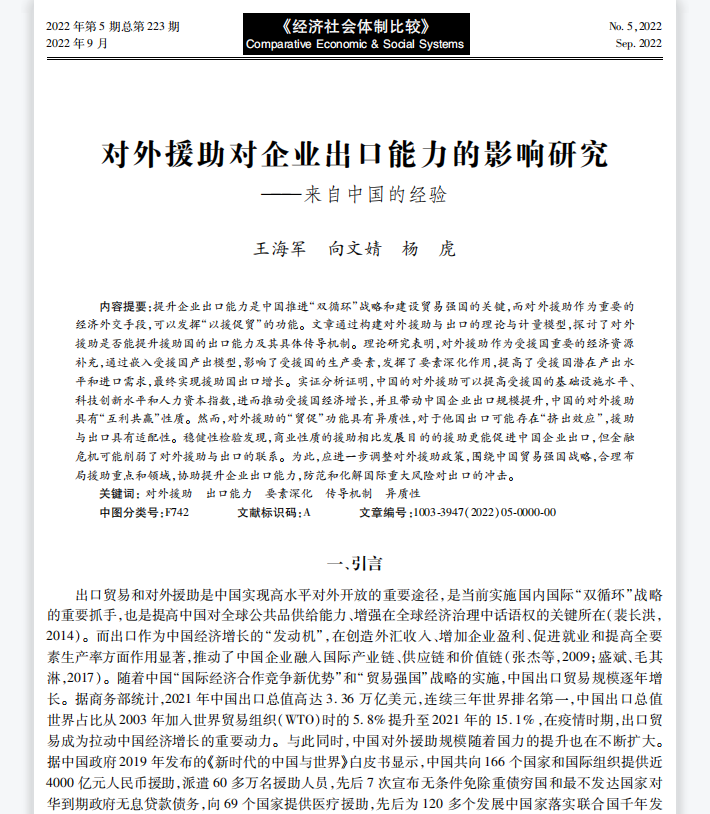 近日,伟德国际bevictor1946金融系副教授王海军老师作为第一作者、与中央财经大学信息公司杨虎副教授等合著文章《对外援助对企业出口能力的影响研究——来自中国的经验》在《经济社会体制比较》2022年第5期首篇正式刊发,该文系王海军老师主持的2021年度校级青年基金项目“对外援助促进中国企业国际化能力的机制研究”阶段性成果。