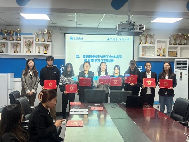 会议第四项:黄珊珊老师为新任员工干部与导师颁发聘书和胸牌。