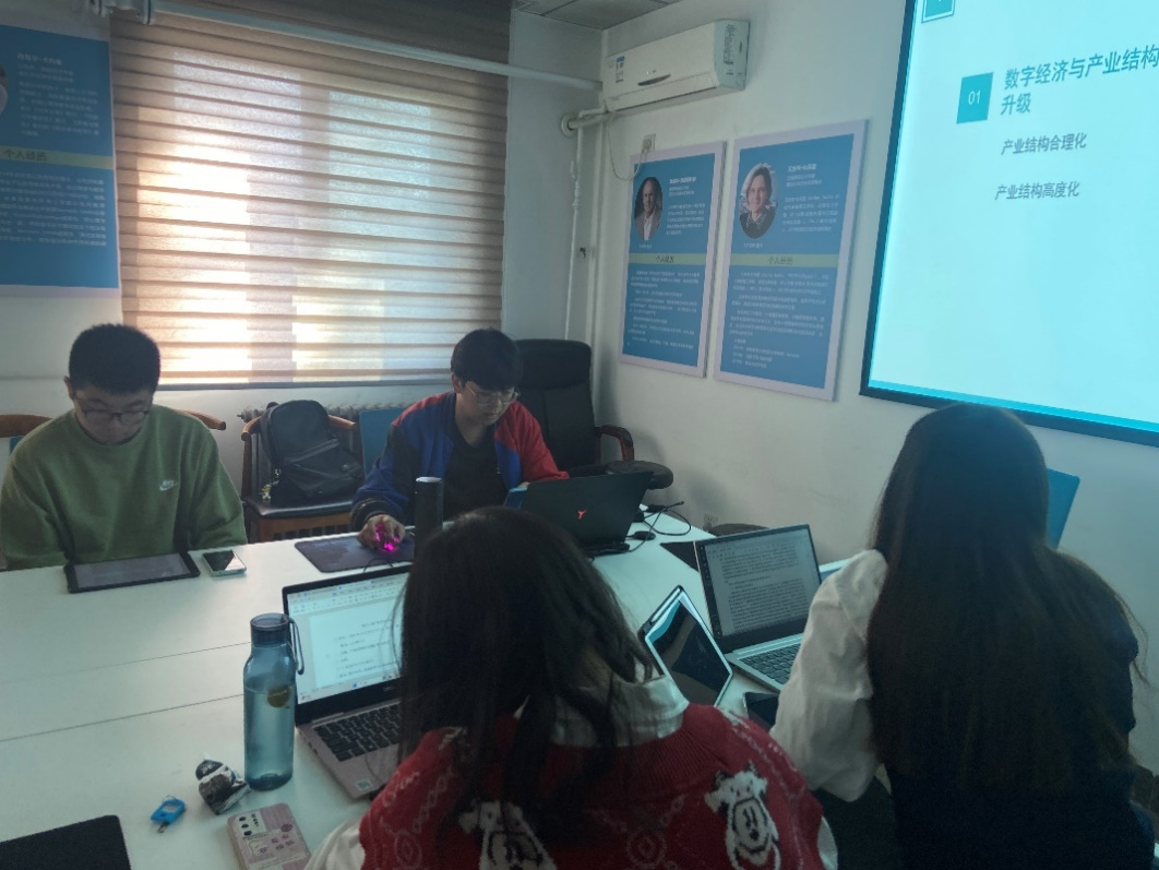本次沙龙的主要发言人是李嘉傲同学和牟文倩同学。李嘉傲同学汇报的论文题目是《数字经济、流通效率和产业结构》,通过中介模型、双门槛效应模型检验数字经济、流通效率和产业结构升级之间的关系;从缩短供应链整体时间、提升供需匹配能力以及消除交换壁垒等方面阐述数字经济提高流通效率的途径。