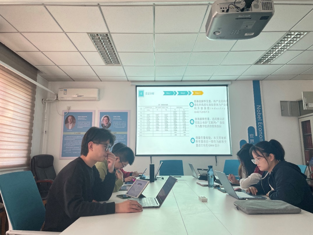 在分享和讨论环节,刘江徽、冯俊玮、杨晓璇、张俊伟同学分别从不同的角度提出了自己的看法,包括数字经济、产业结构、阿里巴巴、电子商务的福利影响等,学术研讨的火花在讨论中迸发。
