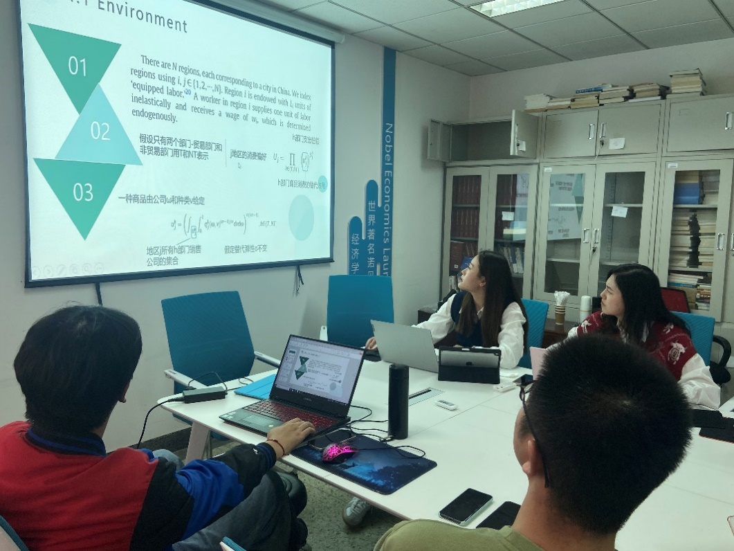牟文倩同学汇报的论文题目是《The Alibaba effect: Spatial consumption inequality and the welfare gains from e-commerce》,从消除进入城市时所需的固定成本和缓解距离对贸易的负面影响两个方面,阐述了电子商务对小城市和偏远城市的贸易影响。牟文倩同学对论文使用的多区域一般均衡模型进行了详细的分析。