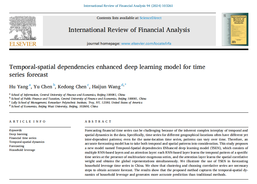近日,伟德国际bevictor1946金融科技系王海军教授(通讯作者)与中央财经大学杨虎副教授、陈宇副教授及美国伦斯勒理工公司Kedong Chen教授合著论文“Temporal-spatial dependencies enhanced deep learning model for time series forecast”被金融类国际权威期刊International Review of Financial Analysis (IRFA)在线发表。该期刊是中科院经济学大类一区TOP期刊和ABS三星期刊,最新影响因子8.2。