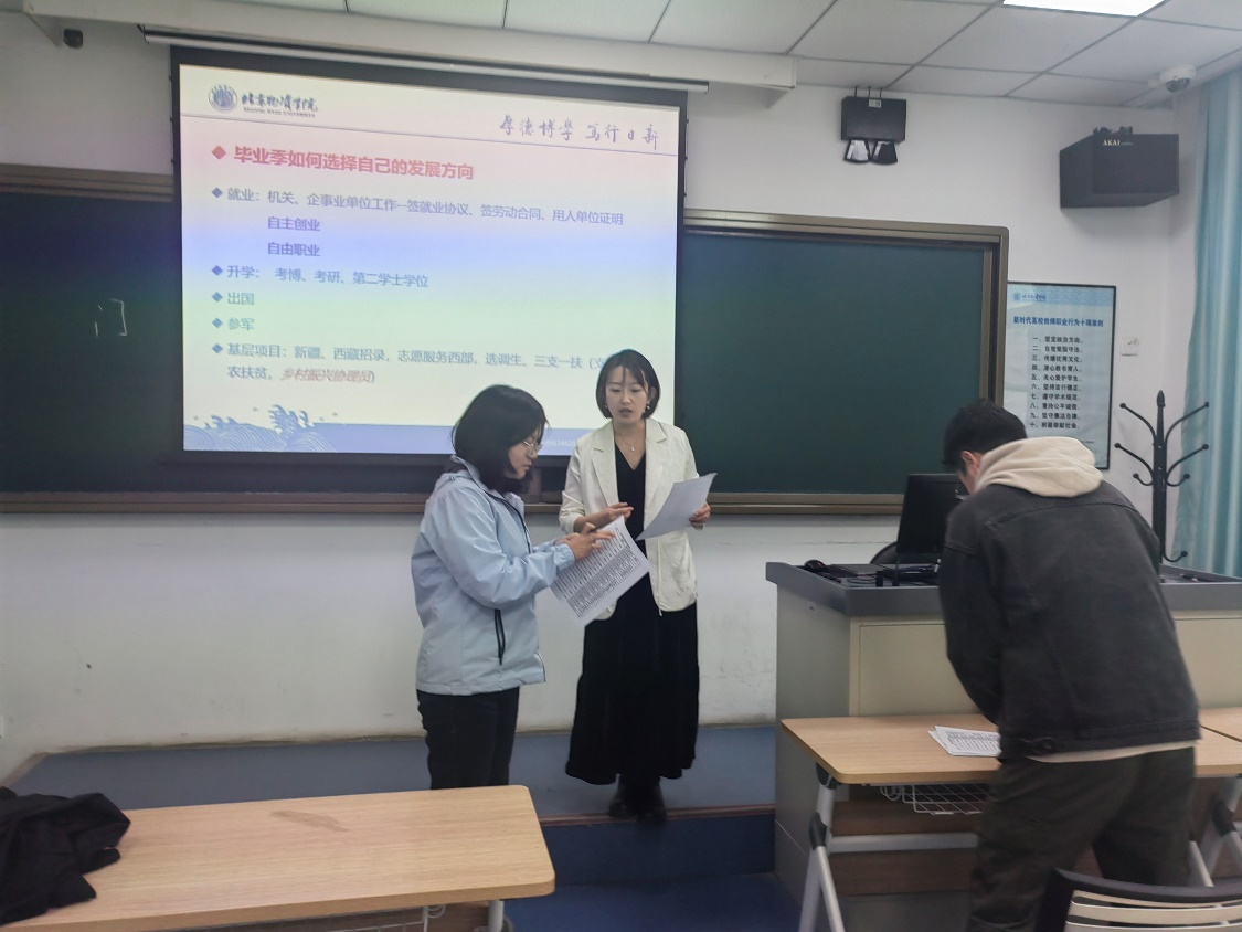 会上,陆畅老师介绍了“2025届就业形势”、“就业政策”和近期宣讲招聘会等相关内容,同时为同学们提供了简历修改、模拟面试、考公经验分享等就业指导的相关资源。她强调,就业应聘要早准备,多行动,鼓励同学们把握好企业招聘的黄金时期。
