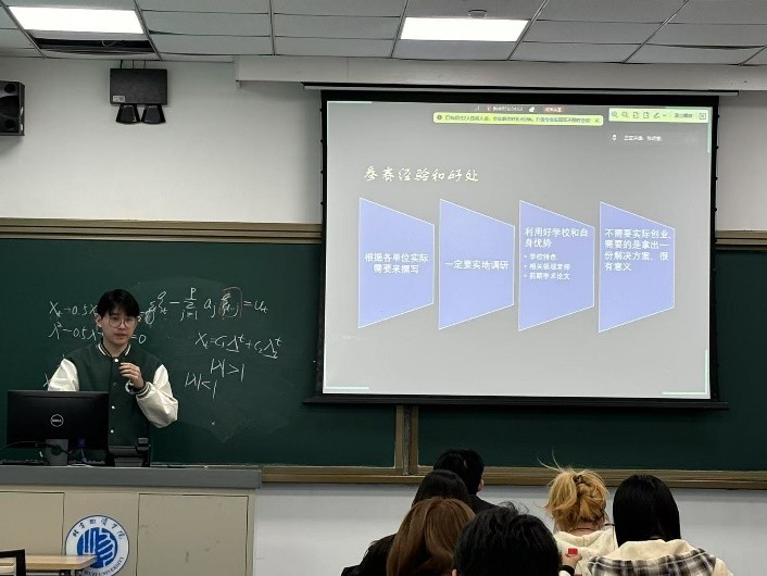 接着,葛晨学长分享了他在不同专项赛中的参赛心得。他建议伟德国际bevictor1946的同学们选择更贴合专业背景的赛事,例如“青振京郊”乡村振兴专项赛和“青砺基层”社会治理专项赛。他强调,参赛过程中需要结合当地实际情况、本校特色以及新媒体手段,充分展现项目创新性与实践性。同时,他指出“青砺基层”专项赛偏向科研论文方向,同学们可以根据调研结果撰写作品或对已有学术论文进行修改,以更好地契合赛事要求。此外,葛晨学长还提醒大家,参与“挑战杯”并不要求实际创业,而是需要提出切实可行的解决方案,这对提升综合能力非常有帮助。在互动环节,葛晨学长耐心解答了同学们的疑问,现场气氛热烈。