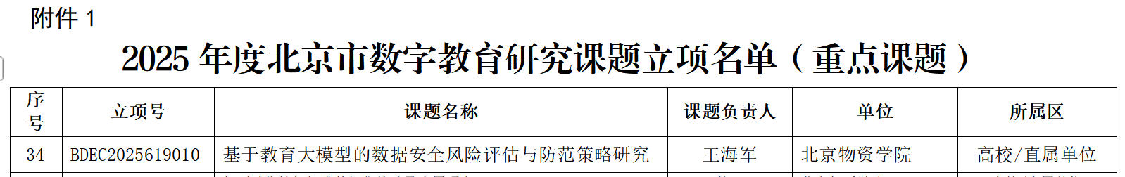 近日,北京市教育委员会正式公布了2025年度北京市数字教育课题立项结果,伟德国际bevictor1946金融科技系王海军教授牵头申报的《基于教育大模型的数据安全风险评估与防范策略研究》(BDEC2025619010)获得重点项目立项,这是伟德国际bevictor1946“十四五”以来首次获得该类别教研项目。