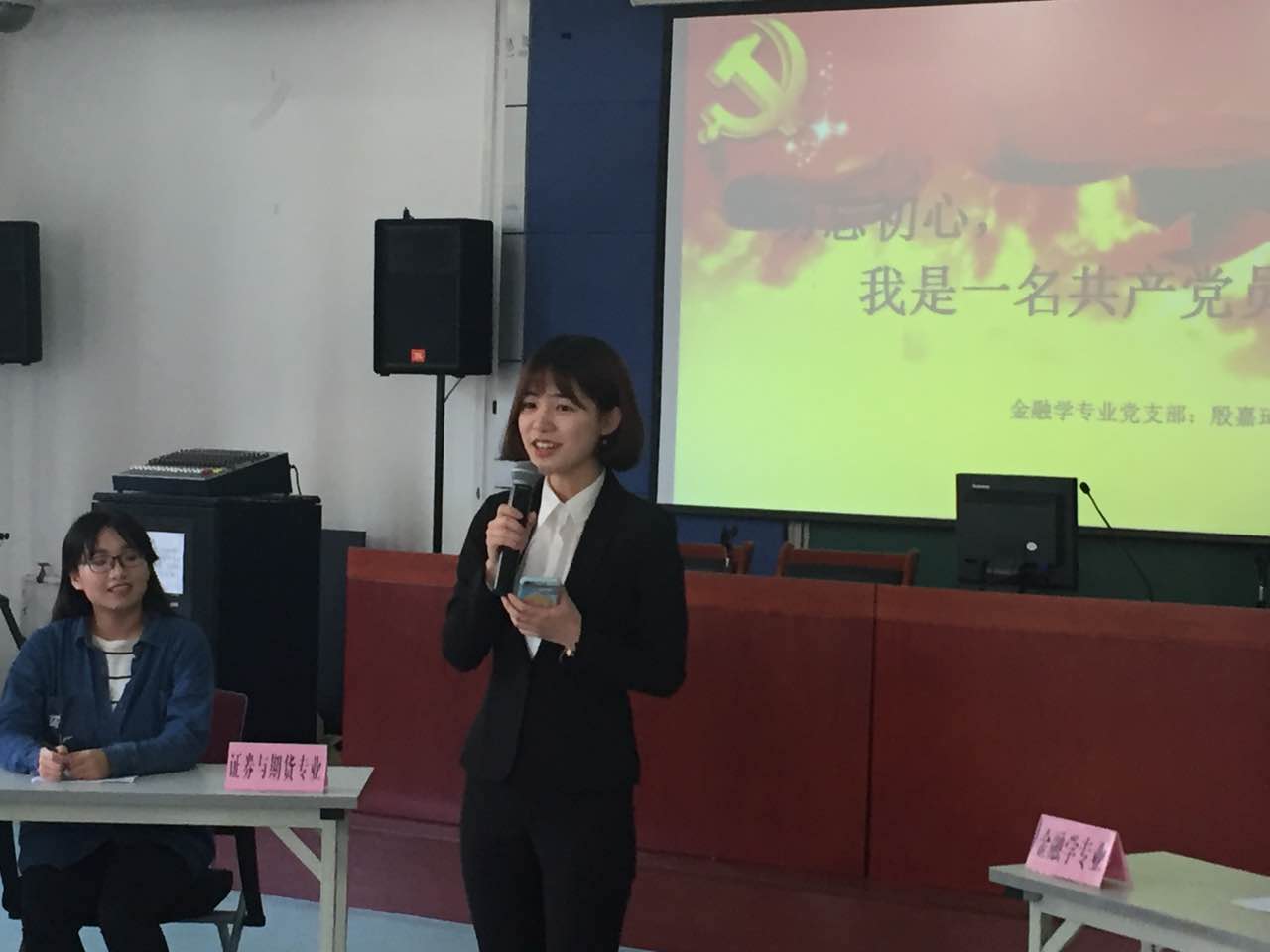 第一环节自由演说展风采;演讲的主题是“我是一名党员”。首先由金融学专业员工党支部选手殷嘉琦进行演讲,通过自己对于党员的认识、自身的实践和2016年感动中国人物秦玥飞投身农村事业的故事生动的阐述了如何做一名优秀的共产党员。殷嘉琦通过生动的事例和富有感染力的语言最终为金融支部得到了92分的高分。然后是经济学专业员工党支部演讲选手刘世霖,他从自身出发,围绕现阶段的专业学习和未来的专业使命谈了自己作为一名党员的要求,最终得到了87分。接下来是国贸支部选手森巴提,她从少数民族党员的角度阐述了如何做一名合格的党员,号召少数民族员工党员,要以“两学一做”促进民族团结。要认真学习党和国家的民族政策理论,尤其是民族宗教史和社会发展史的学习,充分认识民族分裂分子是新疆各族人民的共同敌人,在维护祖国统一、反对民族分裂问题上旗帜鲜明,最终得分为92分。最后上场的选手是期证支部张子文,他从树立正确的入党动机,坚定理念信念,提高能力本领,遵守准则和提高道德境界几个方面阐述了如何做一名合格的党员,最终得分80分。