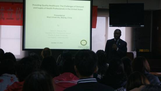 第二位演讲的嘉宾是美国加利福尼亚州查尔斯德鲁大学(CharlesR. Drew University)执行副董事长、全球高校发展委员会(AGAUC)主席Steve O. Michael教授,Steve O. Michael教授的演讲主题是“美国提供优质医疗保健服务:医疗专业人员供给与需求的挑战”。Steve O. Michael教授首先分析了美国社会医疗服务的目前现状,指出美国现有的医护人员远远低于实际需求,并深入浅出地向分析隐藏在其背后的原因,如成本驱动问题、医护人员培养以及医疗行业需求问题、政府非政府机构影响问题等。现在的社会对于专业的医护人员需求量很大,以及对于需求来自各国家、个民族的医护人员的原因。Steve O. Michael教授讲座中不时与与会师生互动交流,现场气氛十分热烈。