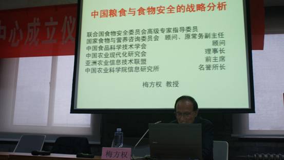 第一位演讲嘉宾为联合国食物安全委员会高级专家指导委员、中国农业现代化研究会理事长、国家食物与营养咨询委员会顾问(原常务副主任)、中国农业科公司信息研究所名誉所长、博士生导师梅方权教授,他演讲的主题是“中国粮食与食物安全的战略分析”。
