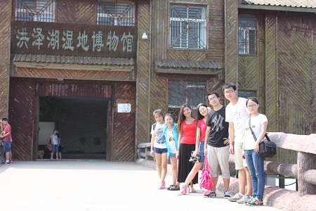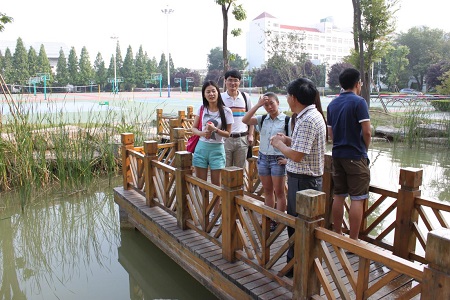 洪泽湖是我国第四大淡水湖,淮安和宿迁两市环湖而邻。两地在追求区域发展的过程中,以前瞻性的战略思维融合经济建设、政治建设、文化建设、社会建设和生态文明建设,充分利用新四军的丰富革命旧址与洪泽湖的湿地自然坏境,突出红色资源和绿色生态,创建“一红一绿相映衬”的洪泽湖湿地自然保护区,走出了一条弘扬革命精神和创新生态文明的发展道路。实践团队还在泗洪中学黄董事长的带领下,参观走访了这所具有悠久历史的公司,深入感受生态文明建设的扎根——公司融南北园林、生态湿地于一体,深美闳约中传达着人与自然的完美和谐。