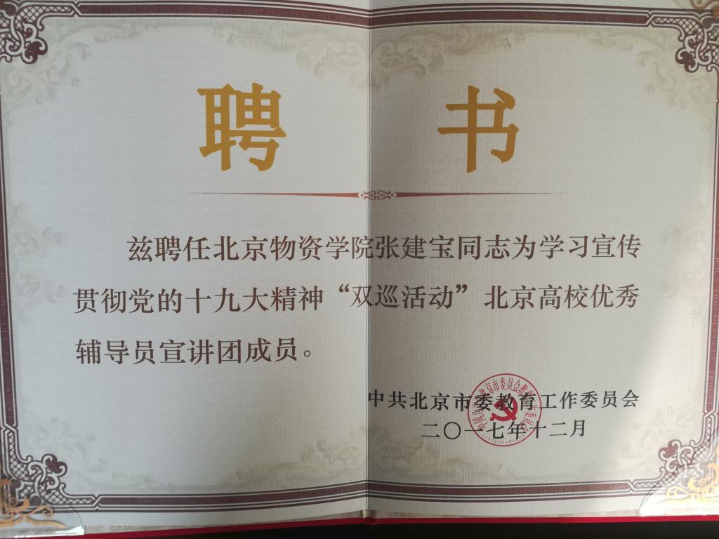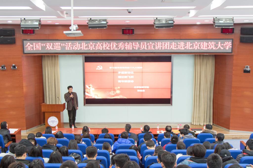 1、伟德国际bevictor1946党委副书记张建宝老师被选为全国“双巡”活动北京高校优秀辅导员宣讲团成员(见链接2),以《矛盾新变化、理论新飞跃、青年新使命》为主题于北京建筑大学开展十九大精神校园巡讲活动,认真、圆满完成宣讲任务。