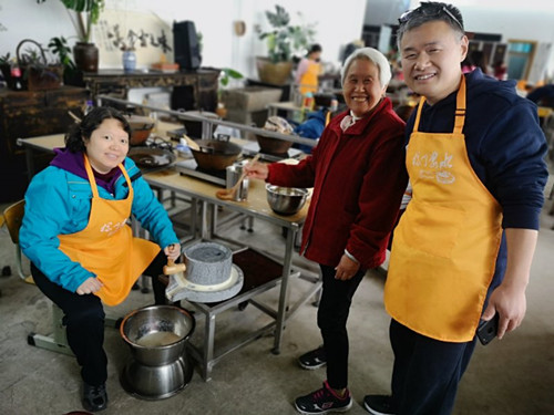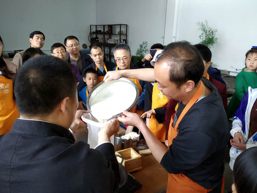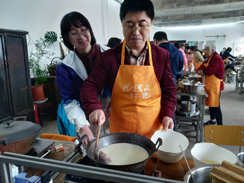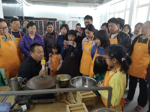 大家按照杨掌门的讲解,每人把分得的浸泡了的黄豆进行磨浆、烧水、搅拌、过滤、点浆、压制等步骤一步一步制作出了热气腾腾的豆腐。在中午简单的餐宴上,大家都吃到了自己亲手制作的豆腐,大人和小孩都很兴奋。