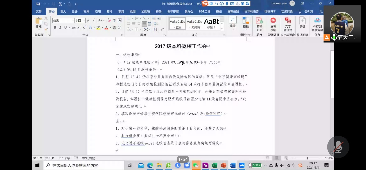 为进一步有效落实伟德源自英国始于19462021春季学期员工返校工作整体安排,同时深入推进2017级本科毕业生就业工作,2021年3月4日晚20.00,伟德国际bevictor1946通过腾讯会议云在线方式召开2017级本科返校暨就业工作培训会。伟德国际bevictor1946经理张国胜、公司党委副书记毛文富、公司2017级专职辅导员姚昊炜及2017级全体本科生参加了会议。会议由姚昊炜老师主持。