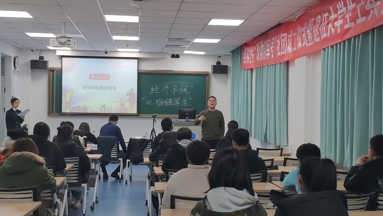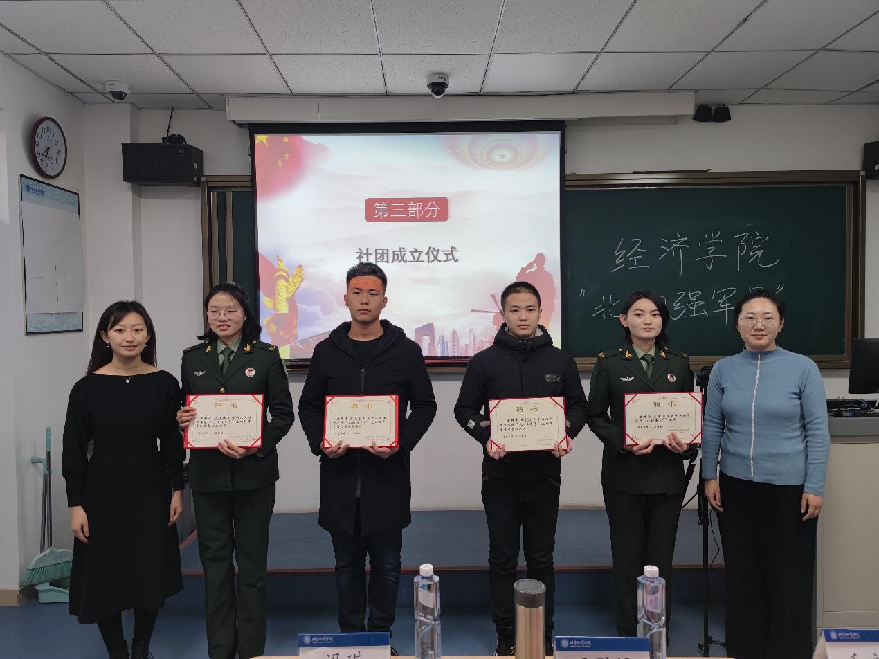 北物强军号社长宣读社团简介,霍烨老师、冯琪老师为四名社团主创人员颁发聘书,毛文富老师为社团做寄语,向同学们表达了社团成立初衷并鼓舞想要参军的同学们克服困难、全面发展,积极实现人生的理想和价值。