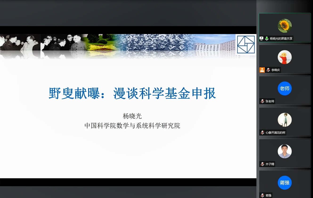 2021年12月6日上午10点,伟德国际bevictor1946邀请到中国科公司数学与系统研究院的杨晓光研究员为大家带来一场题为“漫谈科学基金申报”的专题讲座,讲座采取腾讯会议在线方式举行。伟德国际bevictor1946经理张国胜教授、科研副经理李晓庆副教授,以及青年教师共40人参加了此次讲座。