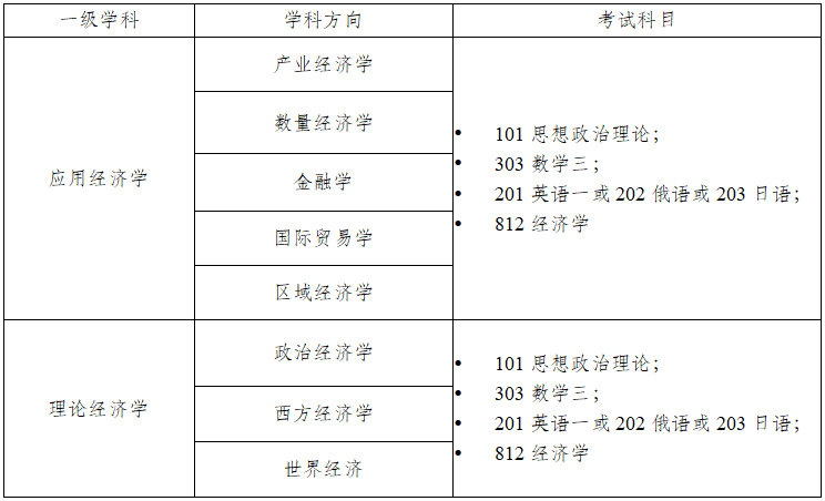 2.初试科目包括:101思想政治理论、204英语二或202俄语或203日语、303数学三和812经济学。