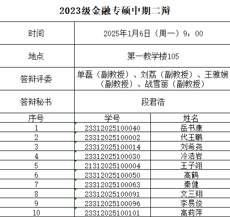 根据公司硕士学位论文管理文件和培养方案的相关要求,现线下开展2023级金融专业硕士研究生学位论文中期二辩工作,具体安排如下: