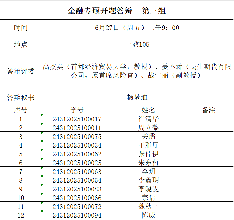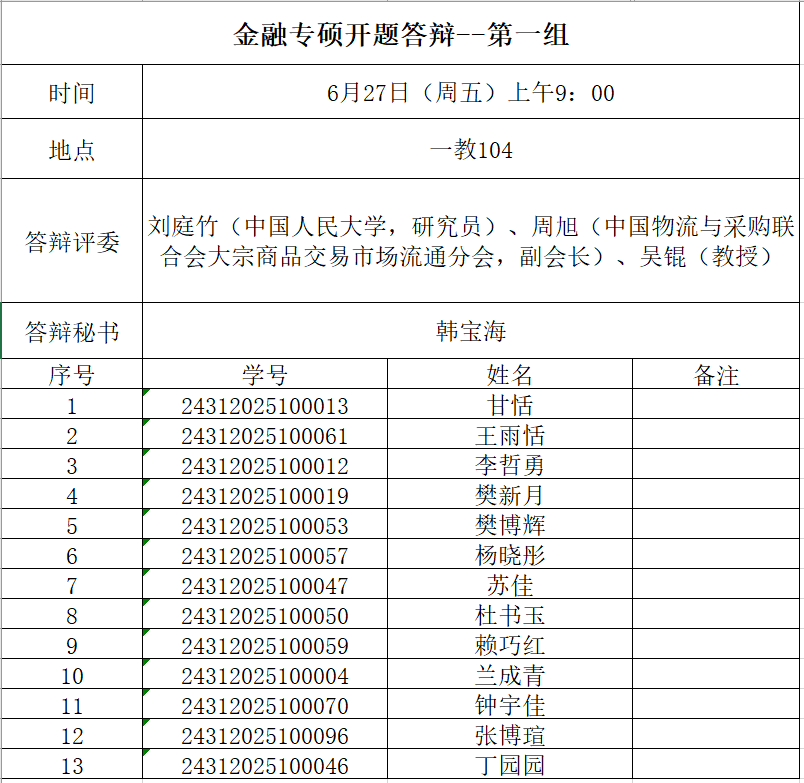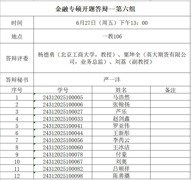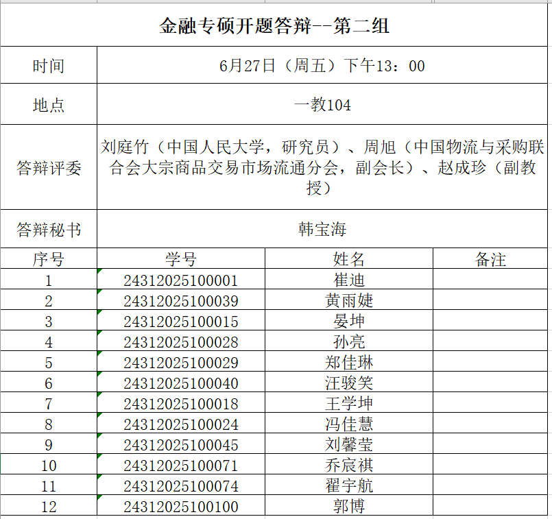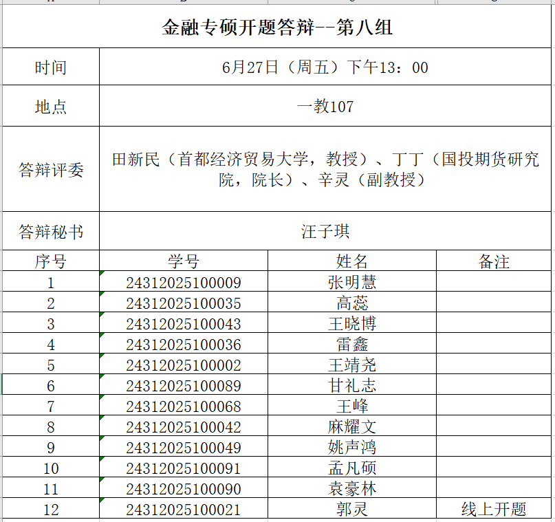 申请参加2024级两年制金融硕士开题答辩研究生,需提交下列材料至各班级负责人,负责人汇总后,以班为单位于6月24日(周二)上午10:00前将所有电子版材料以压缩包形式发送至bwu_mf@163.com,纸质版交到人文楼313,系统里提交开题答辩申请。