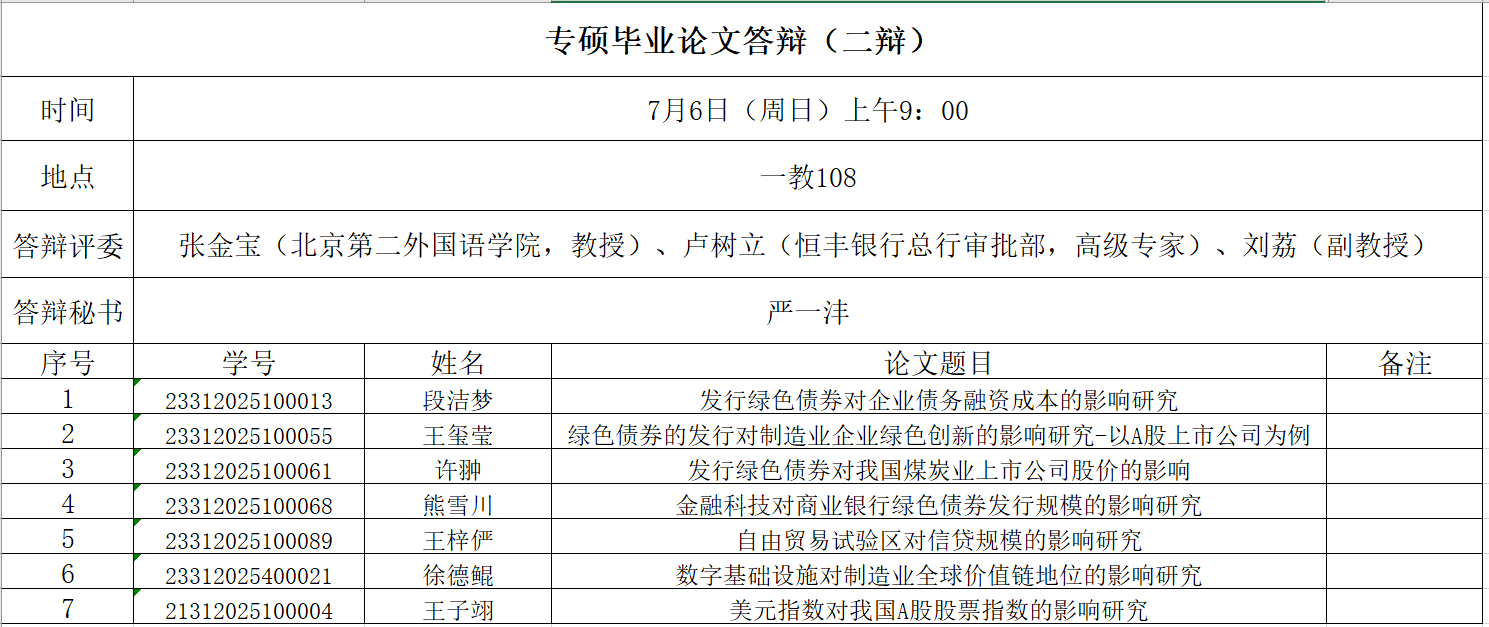 所有参加学位论文二次毕业答辩的2023级专业硕士研究生(含6名金融硕士研究生、1名国际商务专业硕士研究生),请务必于7月4日下午15:00之前将以下材料提交至人文楼313办公室。