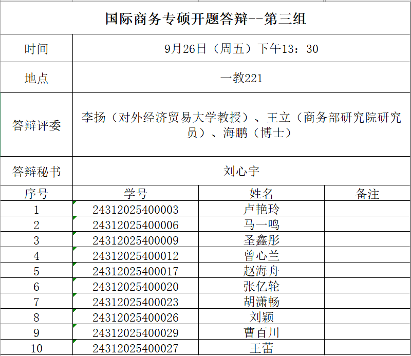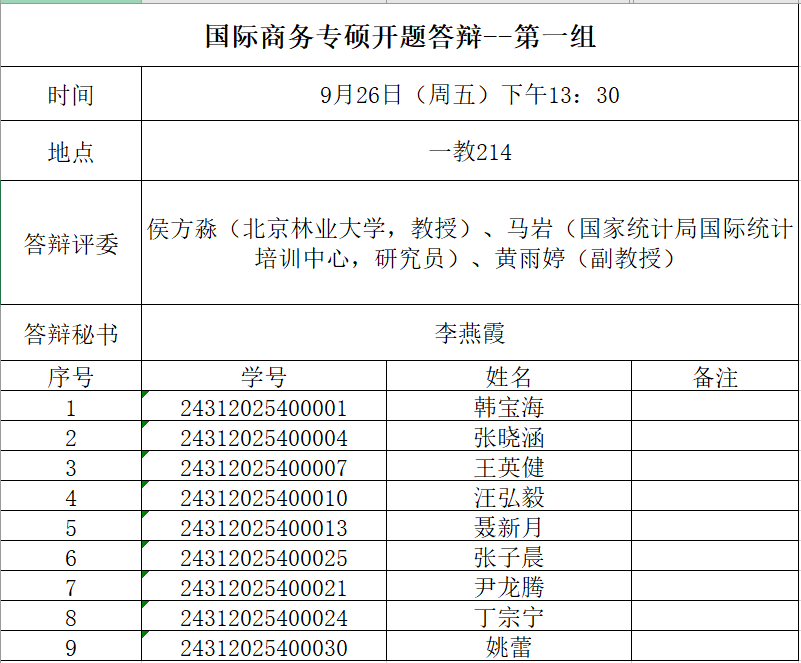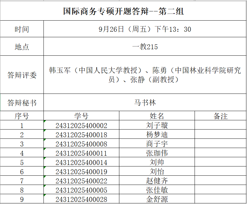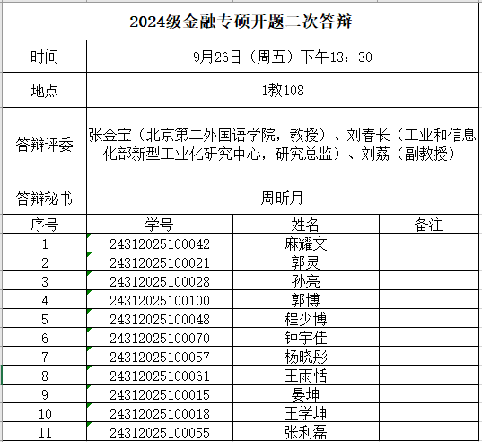 申请参加2024级两年制国际商务硕士和金融硕士二次开题答辩的研究生,需提交下列材料至班级负责人,负责人汇总后,以班为单位于9月24日(周三)上午10:00前将所有电子版材料以压缩包形式发送至指定邮箱:国际商务硕士研究生请发至邮箱:bwu_mib@126.com,二次开题金融硕士研究生请发至邮箱:bwu__mf@163.com(注意是两个下划线“__”)。纸质版开题考核申请表交至人文楼313办公室。同时需上传开题答辩材料至研究生管理系统。
