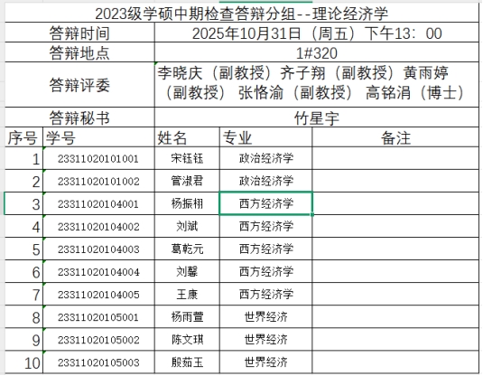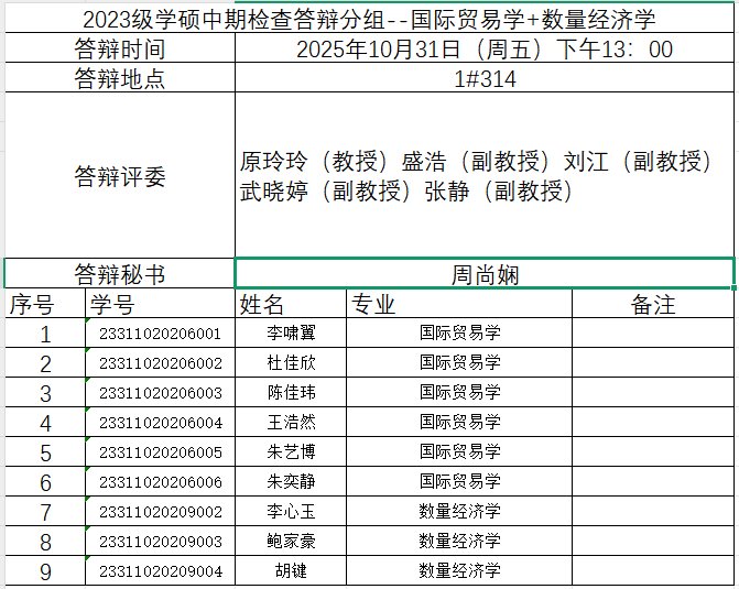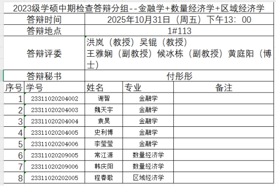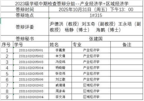 所有在伟德国际bevictor1946参加学位论文中期检查答辩的2023级研究生,包括应用经济学和理论经济学下设的各个专业的硕士研究生,需提交下列材料到各组负责人(每组第一位同学),由各组负责人汇总后于10月29日(周三)上午10:00前发至邮箱jjxykmyx@163.com,除带到答辩现场的纸质版材料于10月29日(周三)上午10:00前交至人文楼313徐老师处,提交材料包括: