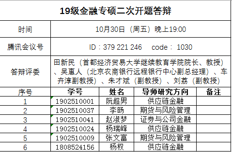 2019级两年制金融硕士研究生进行二次开题答辩,每人需提交下列材料到公司科研秘书,于10月28日(周三)下午4:00前提交至人文楼523,提交材料包括: