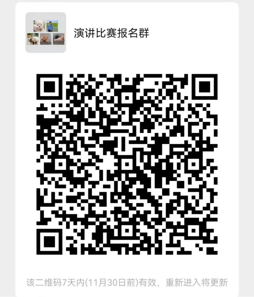 4.有意愿报名的同学请先扫码进群,并于11月24日晚12:00前将自己准备好的演讲稿和PPT发送至伟德国际bevictor1946员工会公共邮箱bwujjxyxsh@163.com,由工作人员进行筛选。