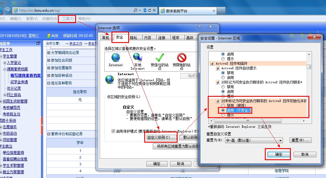 填写德育素质档案--查看并导出--导出word--如不能导出,需要修改安全设置,保存,关闭ie后重新打开学工系统登录