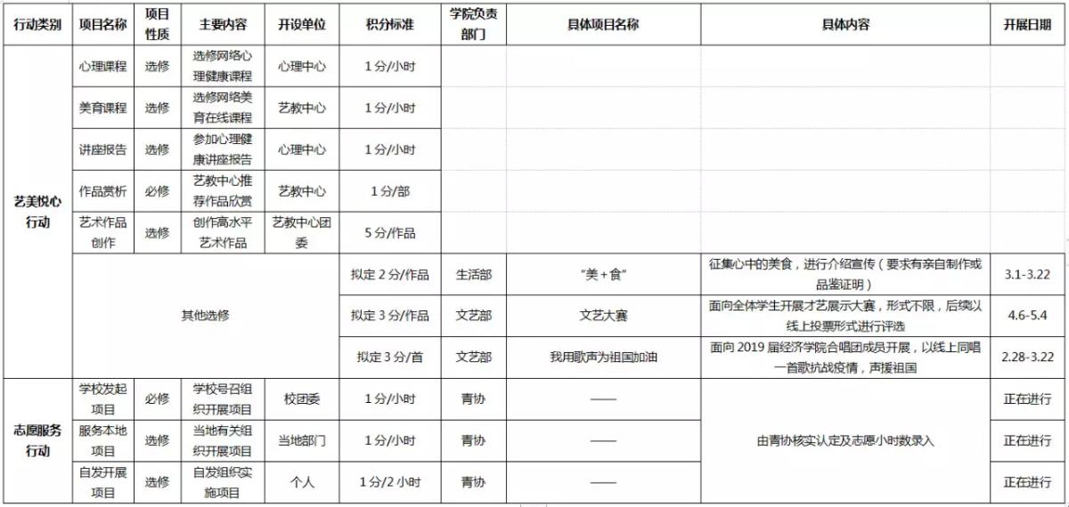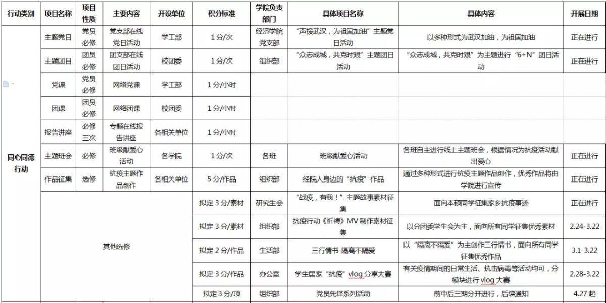 主要包括的项目:党支部在线党日活动、团支部在线团日活动、网络党团课、专题在线报告讲座、班级献爱心活动、经院人身边的“抗疫”作品创作等、“疫”期思考录、“战疫,有我!”主题故事素材征集、抗疫行动《祈祷》MV制作素材征集、三行情书-隔离不隔爱、员工居家“抗疫”vlog分享大赛、党员先锋系列活动等。